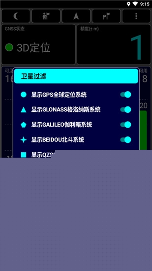 4. 选择要显示的全球卫星导航系统,保存设置后即可开始使用。